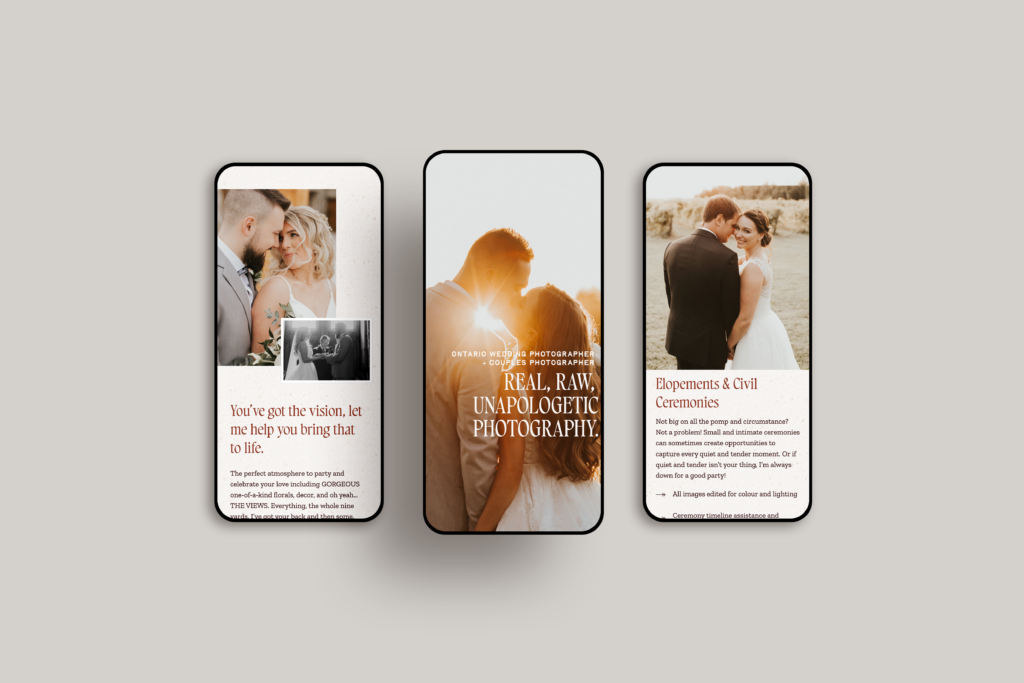 “This updated website will help me find my niche clients in the world of wedding photography! I really wanted my website to be a true reflection of who I am as a person and I really feel confident knowing that Amanda took all my ideas and made a site that will impact those I know who hold the same values and morals as well as see me as an artist and not just a button pusher. I also feel that my new website shows the viewer I really do care for my couples and that I care about what I do and why I do what I do. So I’m confident that my website will attract the right couples/families to book me!”